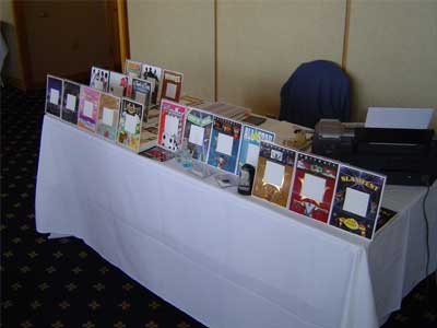 Our set ups includes a professional Photo Backdrop, Professional Lighting, Nikon DSLR cameras, commercial grade dye sublimation printers, our exclusive 7' tall, illuminated 'Fun Folders' Banner (For a more professional looking Set Up). Most companies display their 'Fun frames' by physically setting up a sample of each 'Fun frame' on a separate table. this requires more set up space, more set up time, and 'Fun frames' are cardboard so their easily knocked over when Guests (Esp. kids) handle them when they're deciding which frame to pick.